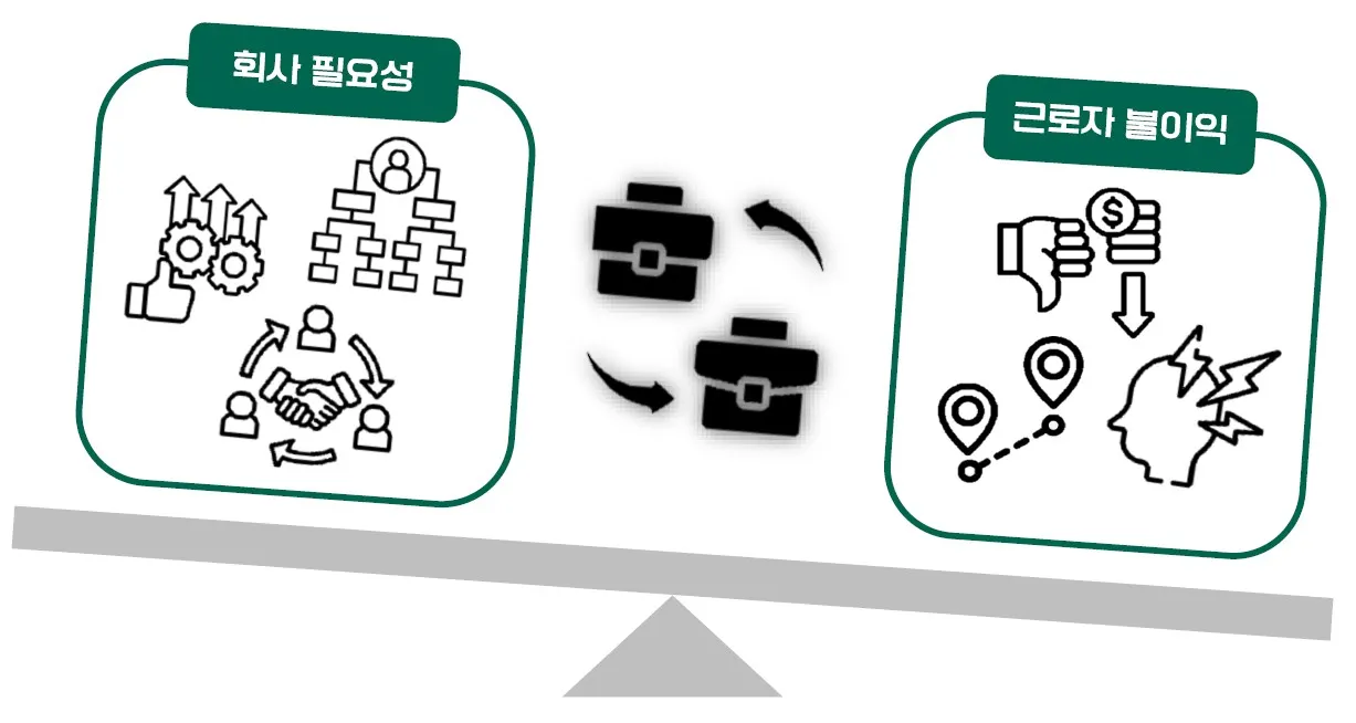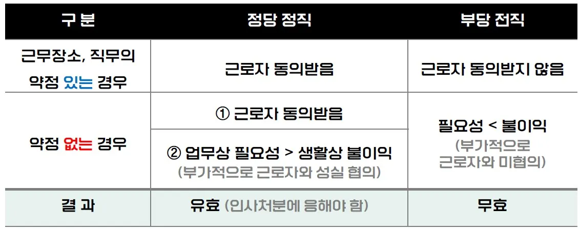 그렇다면, 전직의 부당성 판단에 주요하게 영향을 미치는 요소는 무엇이 있을까요? 앞서 살펴본 판례의 정당성 판단 법리대로 따져보면 됩니다.
