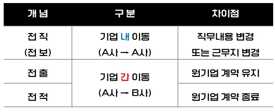 전직과 전보는 기업 내 이동이며, 전출과 전적은 기업 간 인사이동입니다.