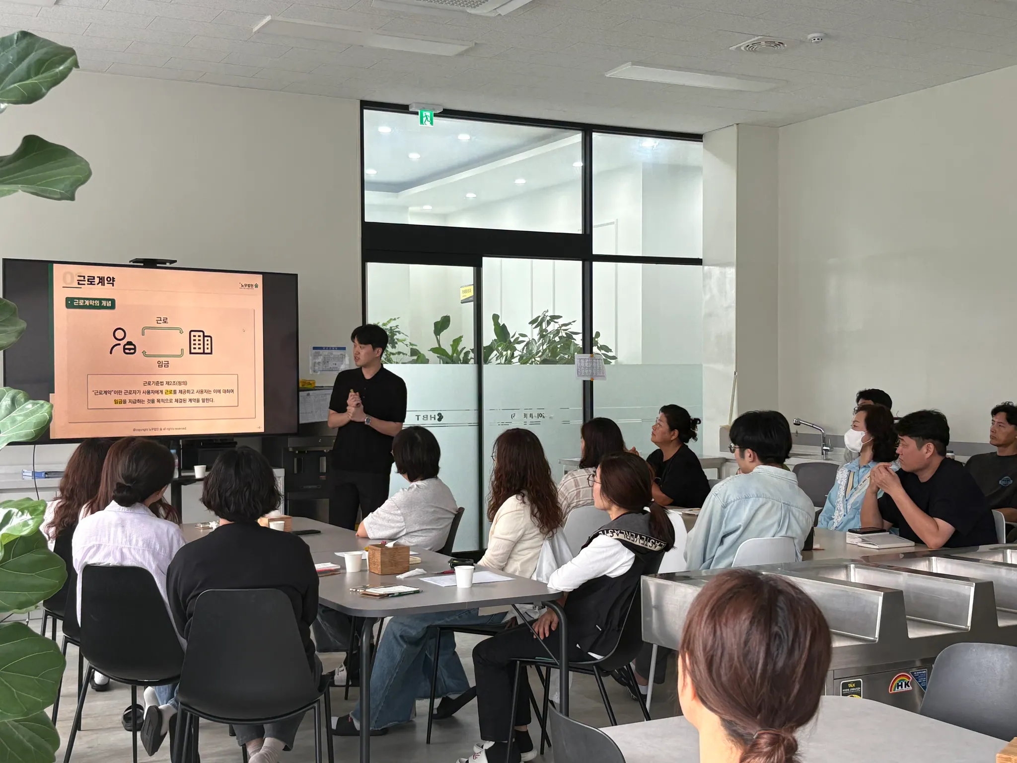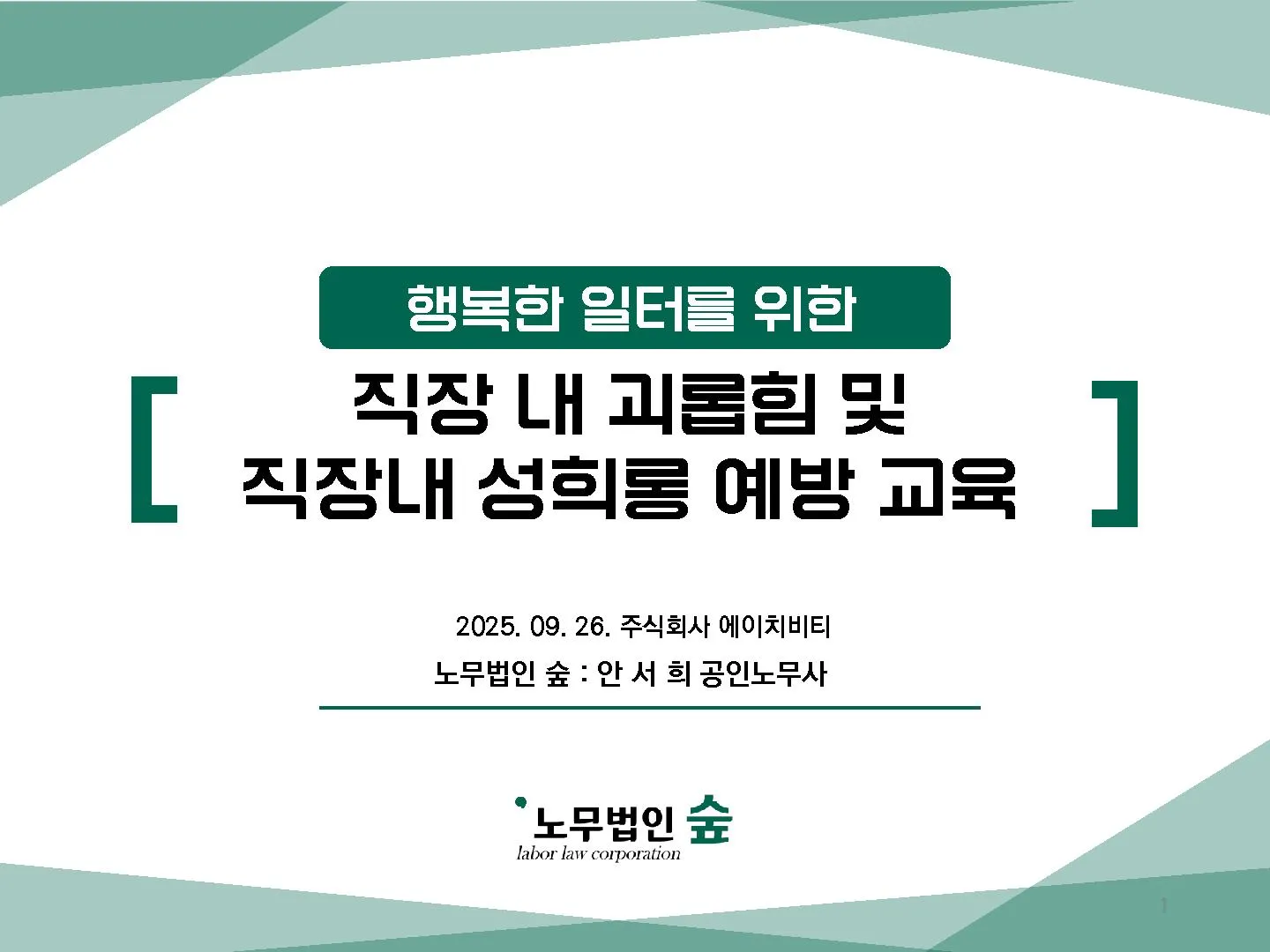 전 직원을 대상으로 직장 내 괴롭힘·성희롱 예방교육을 사례 중심으로 진행하였습니다. 교육생들은 실제 사례들을 통해 공감하고 인식을 높이려는 태도로 경청하며 적극적으로 교육에 참여하였습니다. 과정 중 2024년 직장 내 괴롭힘 신고 건수를 확인하며 놀라워하는 등 예방의 중요성을 체감하기도 했습니다. 아울러 ‘하급자가 상급자에 대해 문제 제기할 경우 지위의 우위성이 성립하는지’와 같은 실무적인 질문이 나올 만큼 적극적으로 의견을 나누며, 직장 내 괴롭힘과 성희롱에 대해 진지하게 고민하는 시간을 보냈습니다.