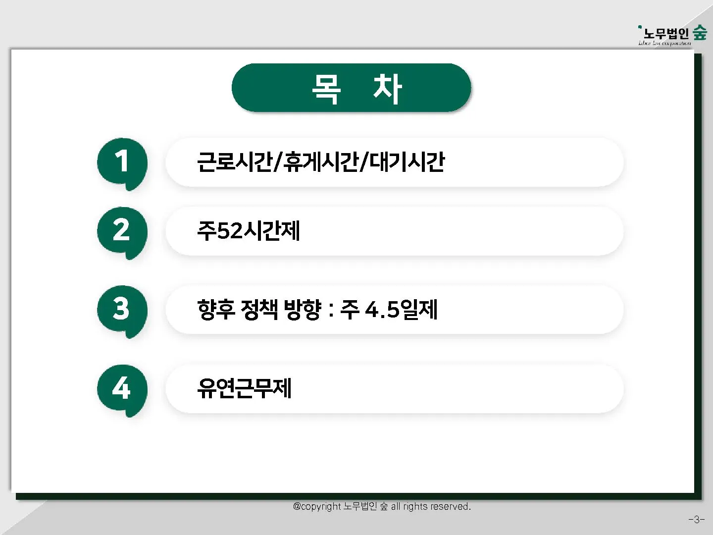 근로기준법상 근로시간과 휴게시간 말고, 대기시간이라는 개념도 있다고요? 뉴스에서 주4.5일제 시행한다고 하는데 우리 사업장은 어떻게 되는 건가요? 등등 근로시간 제도와 유연근무제의 전반에 대해 알아보았습니다.