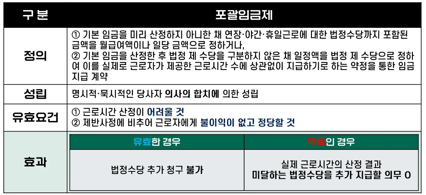 즉 실제 근로시간과 무관하게 포괄 임금 계약에 포함되어 있는 법정수당( 연장·야간·휴일근로수당 등)의 추가 청구가 불가능합니다.
